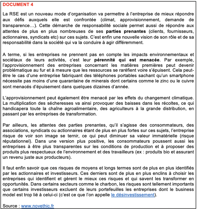 11. A partir de l’analyse du document 4, relevez les différents enjeux du RSE pour l’entreprise :
